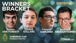 GMs Jorden van Foreest, Dmitrij Kollars, Fabiano Caruana, and Nodirbek Abdusattorov move on to the Champions Chess Tour ChessKid Cup 2023 Winners Semifinals in Division I. Respectively, they defeated GMs Hikaru Nakamura, Alireza Firouzja, Aleksandr Shimanov, and Jules Moussard—who now enter the Losers Bracket—in the Quarterfinals on Monday.