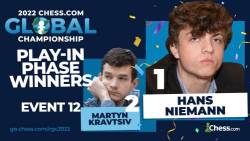 GMs Eduardo Iturrizaga and Hans Niemann were the winners of the eleventh and twelfth Play-ins of the Chess.com Global Championship. GMs Kirill Alekseenko and Martyn Kravtsiv each won second place respectively, joining the winners in advancing to the knockout phase.