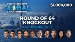 From this knockout phase, eight players will qualify for the Global Chess Championship Finals, to be held November 2-7, on site in Toronto, Canada, where a $200,000 first prize will be at stake. Meanwhile, the 32 players who get knocked out in the first round still go home with $5,000. The Global Chess Championship is Chess.com’s first-ever event with a $1 million total prize fund.