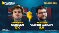 GM Magnus Carlsen defeated GM Maxime Vachier-Lagrave in the 2022 Speed Chess Championship second semifinal match on Friday.