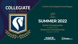 The Collegiate Chess League is excited to announce the 2022 summer season featuring the bullet and bughouse college championships! This summer season will span the four weeks of August and starts with the bullet championship on August 6 with the finals on August 13. Bughouse will start the following week on August 20 with the finals on August 28. All matches will be streamed live on our Twitch and YouTube channels.
