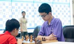 Kỳ thủ Bành Gia Huy (phải) tại giải cờ vua nhanh Hà Nội Mở rộng ở Cung Điền kinh trong nhà Hà Nội, quận Nam Từ Liêm, tháng 11/2023. Ảnh: Vietnamchess