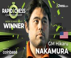 The Rapid Chess Championship presented by Coinbase entered its 22nd week on Sunday and was won by a rampant GM Hikaru Nakamura who toppled GM Fabiano Caruana after winning all of his games en route to his seventh knockout victory.