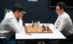 Firouzja (trái) bộc lộ sự thiếu kinh nghiệm trong lần đầu dự Candidates ở tuổi 19, ở vòng sáu hôm 23/6 tại Madrid, Tây Ban Nha. Ảnh: Chess.com
