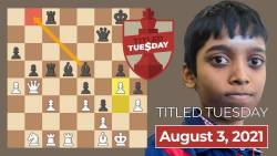 GM Praggnanandhaa Rameshbabu won his first Titled Tuesday on August 3, with a score of 9.5/11. He won on tiebreaks over GM Oleksandr Bortnyk and GM Dmitry Andreikin, who also scored 9.5/11. In fourth place was GM Samvel Ter-Sahakyan with the best tiebreaker score of players on 9/11.