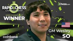 GM Wesley So won week 21 of the 2022 Rapid Chess Championship presented by Coinbase, defeating GM Sam Sevian in the closely-fought final match that culminated in a bullet playoff.