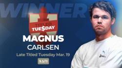 After GM Pranav Venkatesh won the early edition of the March 19 Titled Tuesday with relative ease, GM Magnus Carlsen needed the second tiebreak to earn his first win in the event since January 30. It was little-known Chinese GM Xu Xiangyu who pushed Carlsen to the brink. The wins were Pranav’s second (previously on October 31, 2023) and Carlsen’s 14th since February 2022.