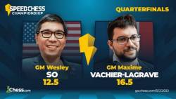 GM Maxime Vachier-Lagrave overcame GM Wesley So in the 2022 Speed Chess Championship on Wednesday. Early in the match, Vachier-Lagrave gained as high as a four-point lead, but So fought back to even the score in the bullet segment. With just 12 minutes left on the match clock, the French grandmaster entered a new gear, winning four games in a row to seal victory.
