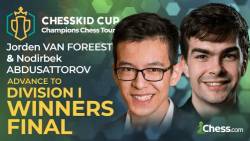 GMs Jorden van Foreest and Nodirbek Abdusattorov advance to the Winners Final of the Champions Chess Tour ChessKid Cup 2023 Division I after defeating GMs Dmitrij Kollars and Fabiano Caruana respectively. In the Losers Bracket, GMs Alireza Firouzja and Jules Moussard respectively eliminated GMs Hikaru Nakamura and Aleksandr Shimanov. Firouzja and Moussard will play in the Losers Quarterfinals.